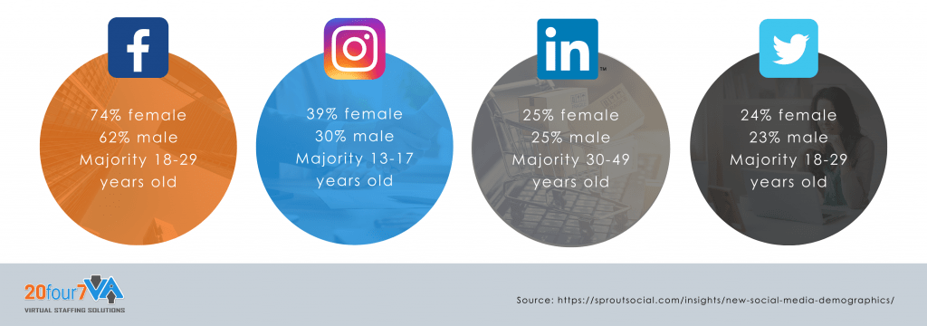 When creating your social channels, choose quality over quantity. Maintaining a truly engaging page on just or two platforms is much better than having an account on 10 different social channels and barely posting any content on each of these accounts. To help you pick the best platform for your business, here are some key audience data for some of the top social media platforms: