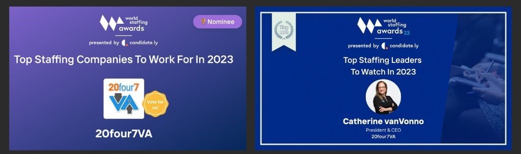 “It’s always an honor to be included in the Top 100 Staffing Leaders to Watch award by the World Staffing Summit, but it’s especially an honor this year because our company was recognized as well” said Catherine vanVonno. “I’m incredibly proud of my team at 20four7VA for their hard work and dedication in helping remote workers find success in the virtual workplace.”