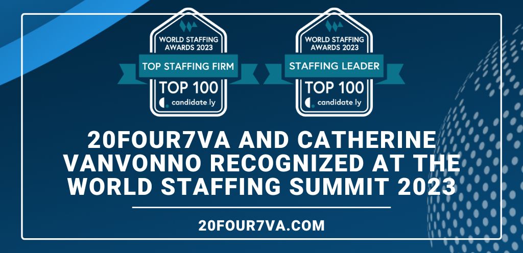 20four7VA and Catherine vanVonno were both recognized in the ‘Top 100 Staffing Companies to Work for in 2023‘ and ‘Top 100 Staffing Leaders to Watch in 2023‘ at the virtual World Staffing Summit by Candidate.ly held Tuesday, January 24th, 2023.