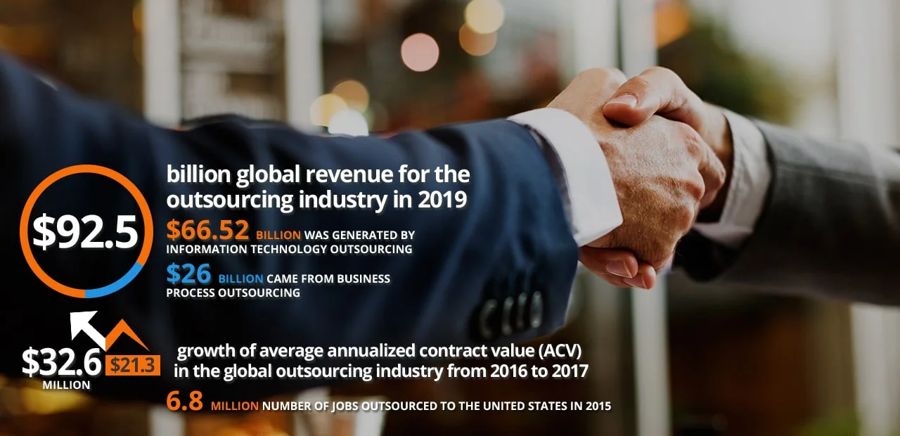 Today, the global outsourcing market is massive. In 2019, it amounted to a staggering $92.5 billion, with information technology outsourcing making up the bulk of the industry’s global revenue.
