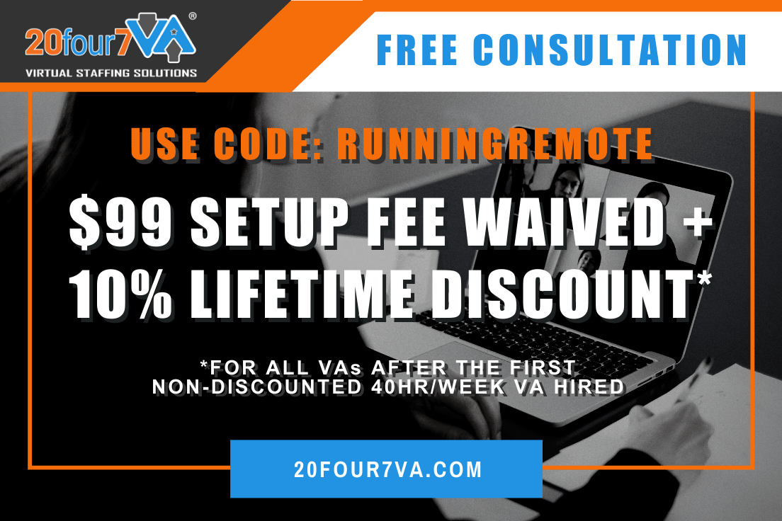 As an exhibitor, 20four7VA will have a virtual booth and will be available for meetings and networking sessions. An exclusive offer of waived setup fee ($99 value) + 10% lifetime discount* is being offered to all Running Remote attendees.
