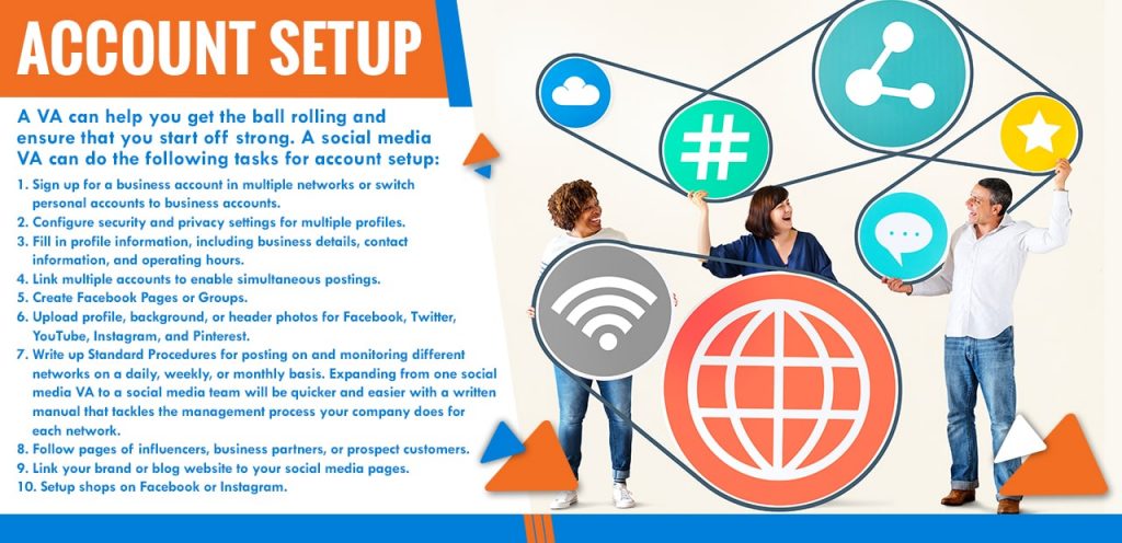 A VA can help you get the ball rolling and ensure that you start off strong. Therefore, have a social media VA do the following tasks for account setup: