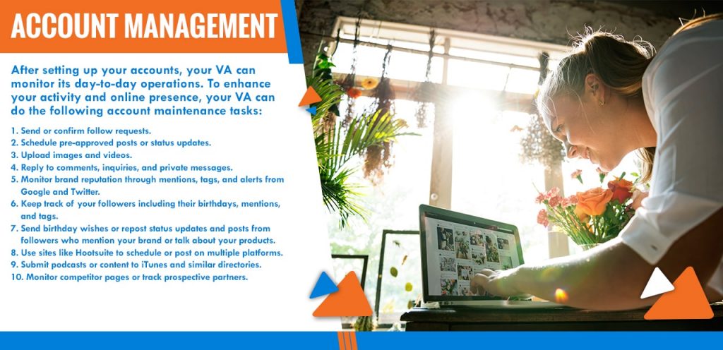After setting up your accounts, your VA can monitor its day-to-day operations. To enhance your activity and online presence, your VA can do the following account maintenance tasks: