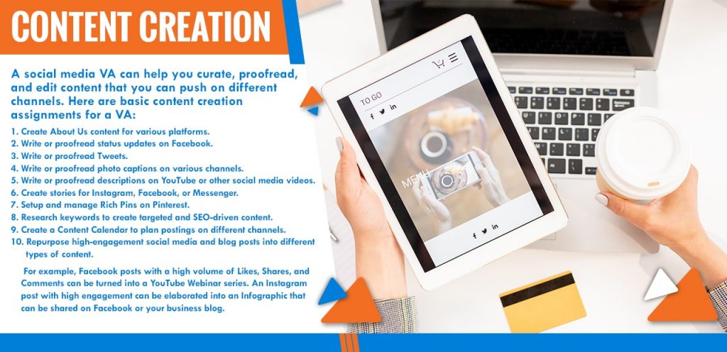 To make your social pages more interesting, a social media VA can help you curate, proofread, and edit content that you can push on different channels. Here are basic content creation assignments for a VA: