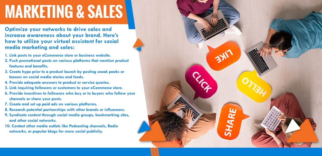 Optimize your networks to drive sales and increase awareness about your brand. Here’s how to utilize your virtual assistant for social media marketing and sales: