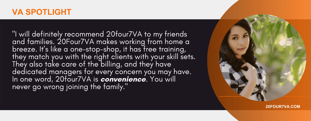 I will definitely recommend 20four7VA to my friends and families. 20four7VA makes working from home a breeze. It’s like a one-stop-shop — it has free training, they match you with the right clients with your skill sets. They also take care of the billing, and they have dedicated managers for every concern you may have. In one word, 20four7VA is convenience. You will never go wrong joining the family.
