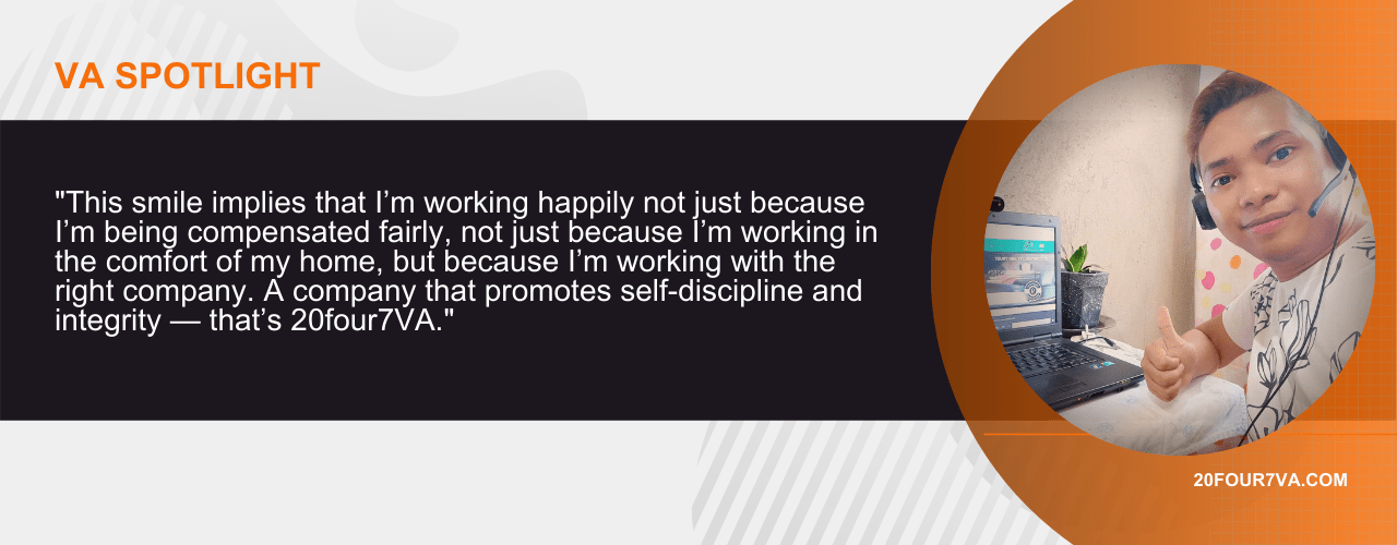 For his parting words, Chan said that people who know him deeply can really tell the difference between his smile before and his smile now that he’s working with 20four7VA. He concludes, “This smile implies that I’m working happily — not just because I’m being compensated fairly, not just because I’m working from the comfort of my home — but because I’m working with the right company. A company that promotes self-discipline and integrity — that’s 20four7VA.”