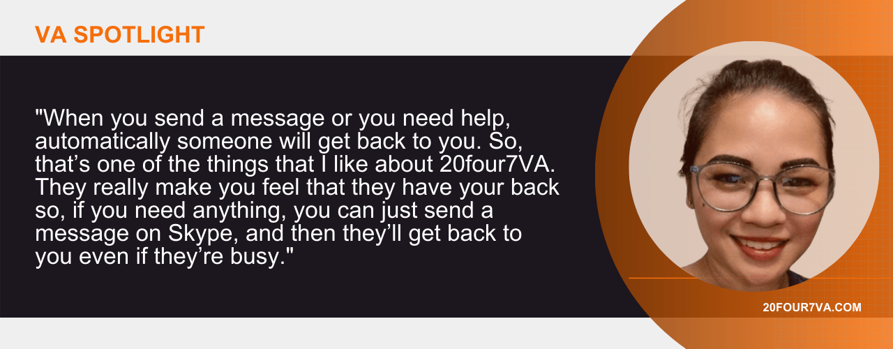 When you send a message or you need help, automatically someone will get back to you. So, that’s one of the things that I like about 20four7VA. They really make you feel that they have your back so, if you need anything, you can just send a message on Skype, and then they’ll get back to you even if they’re busy. That’s one of the things that I didn’t get from UpWork or from the traditional workplace. Even though it’s online, I can still feel that the people here or the staff here are much more approachable. They do have a friendly and very helpful staff so, you don’t really need to worry about, if you have any concerns or questions about your tasks there’s always someone that’s going to be available for you. That’s why it’s called 20four7VA because we have agents working around the clock. So, it’s really easy to get assistance.