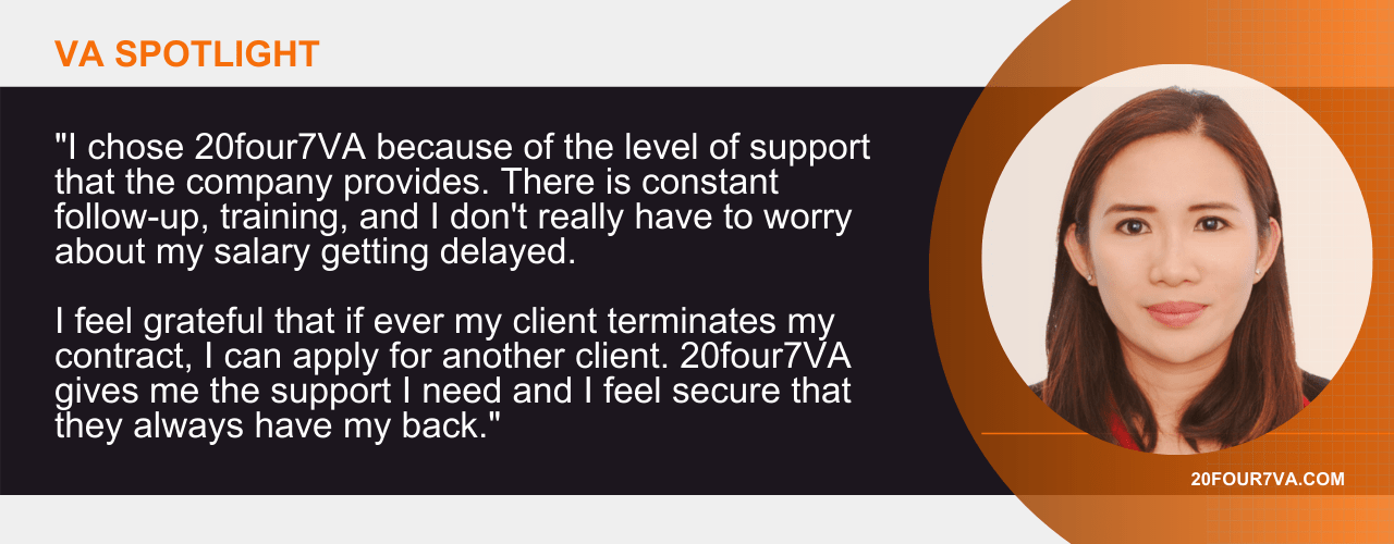 I chose 20four7VA because of the level of support that the company provides. There is constant follow-up, training, and I don’t really have to worry about my salary getting delayed. Right now, there’s COVID and people are losing jobs. I feel grateful that if ever my client terminates my contract, I can apply for another client. 20four7VA gives me the support I need and I feel secure that they always have my back.