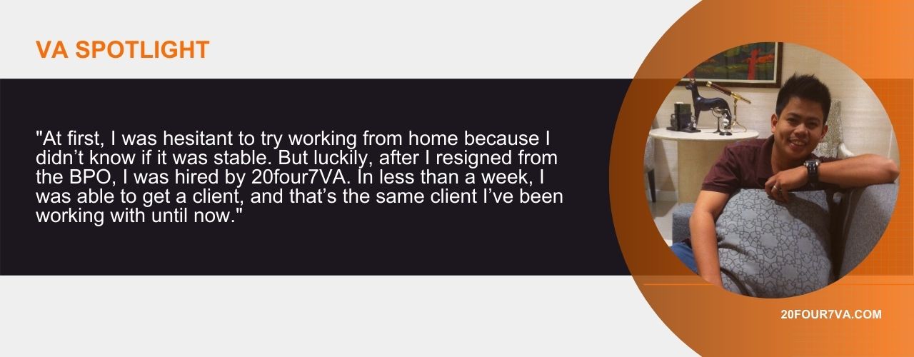 At first, I was hesitant to try working from home because I didn’t know if it was stable. But luckily, after I resigned from the BPO, I was hired by 20four7VA. In less than a week, I was able to get a client, and that’s the same client I’ve been working with until now.