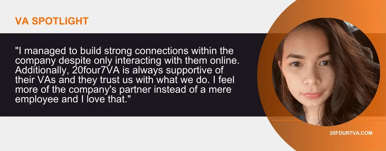 This is actually my first remote work agency and what keeps me here is that I have a support system even if I’m physically alone. I managed to build strong connections within the company despite only interacting with them online. Additionally, 20four7VA is always supportive of their VAs and they trust us with what we do. I feel more of the company’s partner instead of a mere employee and I love that.